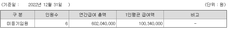 미등기임원의 평균연봉은 1억원이고 직원수는 6명입니다.