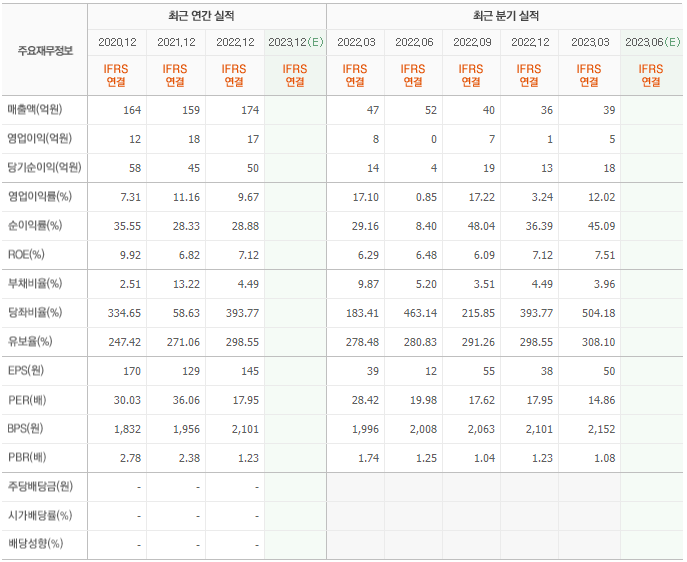 2022년 매출은 174억, 영업이익은 17억, 당기순이익은 50억입니다. 그리고 영업이익률은 9.67%입니다.