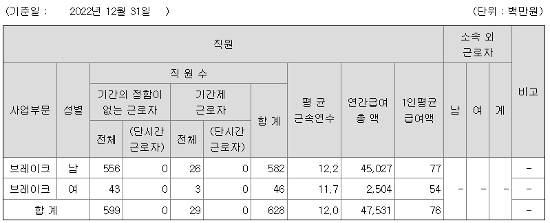 | 사업부문 | 성별 | 직원수 | 평균근속연수 | 평균연봉(백만) |