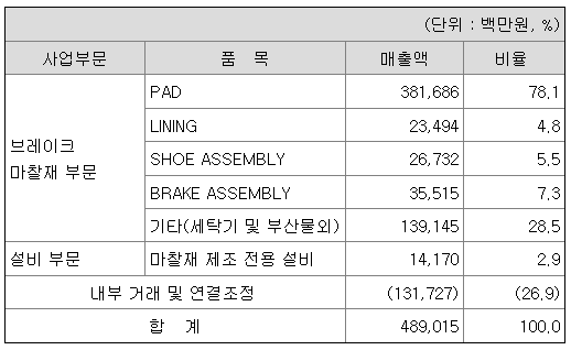 당사는 브레이크 PAD, LINING, SHOE 및 BRAKE ASSEMLY 그리고 기타 세탁기용 밴드브레이크 라이닝 등을 제조/판매하는 마찰재 부문과 브레이크 마찰재 제조 전용설비를 제조/판매하는 설비부문이 있습니다. 당사의 제품별 매출액 및 비율은 다음과 같습니다.