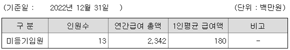 미등기임원의 평균연봉은 1억 8000만원이고 직원수는 13명입니다.