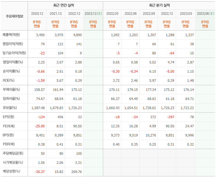 2022년 매출은 4890억, 영업이익은 141억, 당기순이익은 9억입니다. 그리고 영업이익률은 2.88%입니다.