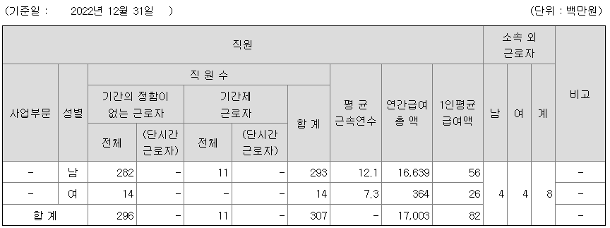 | 사업부문 | 성별 | 직원수 | 평균근속연수 | 평균연봉(백만) |