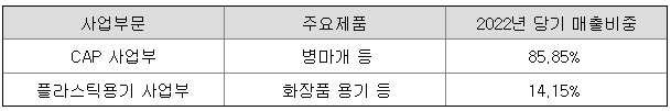 연결기업은 CAP 사업부, 플라스틱용기 사업부 총 2개의 사업을 영위하고 있습니다. 각 사업부문별 주요제품 및 매출비중은 다음과 같습니다.