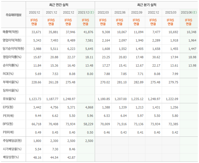 2022년 실적은 3조 7946억, 영업이익은 8489억입니다. 그리고 영업이익률은 22.37%입니다.