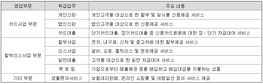 할부리스사업 부문은 고객이 전자, 내구재, 자동차 등을 할부로 구매할 수 있도록 할부금융 서비스와 일반고객을 대상으로 자금대여 서비스를 제공하고 있으며, 자동차 등을 당사가 구입하여 이용자에게 대여하고 이용료를 받는 리스/렌탈 서비스를 제공하고 있습니다.
