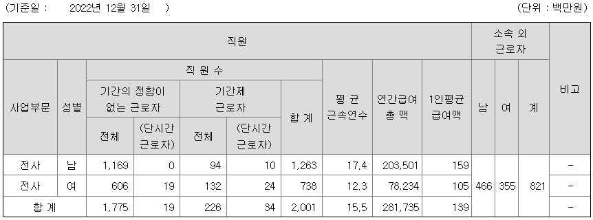 | 사업부문 | 성별 | 직원수 | 평균근속연수 | 평균연봉(백만) |