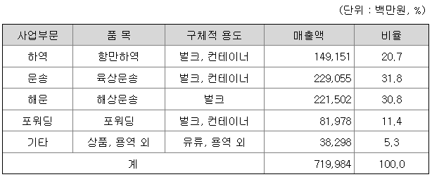 인터지스(주)는 지난 66년간 축적된 항만운영의 노하우를 바탕으로 컨테이너 및 벌크화물 등을 하역하는 항만하역사업과 전국 각지의 물류 네트워크를 활용하여 후판, 형강, 봉강 등의 철강제품 및 수출입 컨테이너를 운송하는 육상운송사업, 그리고 동국제강(주)의 철강 원재료 및 국내외 3PL 고객들을 대상으로 하는 해상운송사업과 포워딩사업을 주요 사업으로 영위하고 있습니다. 그 외 터미널 운영과 주유소 등의 부수사업을 수행하고 있으며, 해외시장 진출 등을 통하여 사업의 영역을 넓혀 나가고 있습니다.