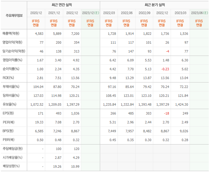 2022년 매출은 7200억, 영업이익은 354억, 당기순이익은 313억입니다. 그리고 영업이익률은 4.92%입니다.