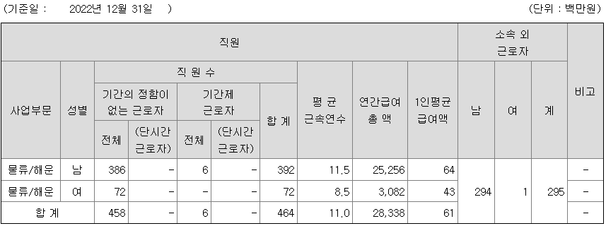 | 사업부문 | 성별 | 직원수 | 평균근속연수 | 평균연봉(백만) |
