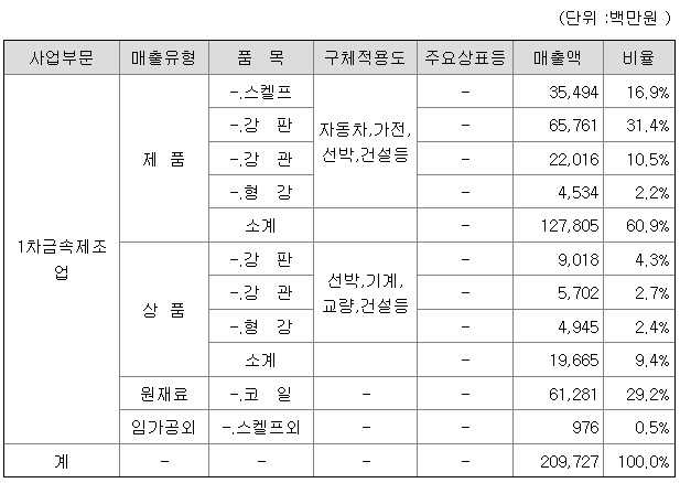 당사는 열연,냉연코일을 이용하여 자동차,가전업체등에 가공판매하고 있습니다. 각제품별 매출액 및 총 매출액에서 차지하는 비율은 다음과 같습니다