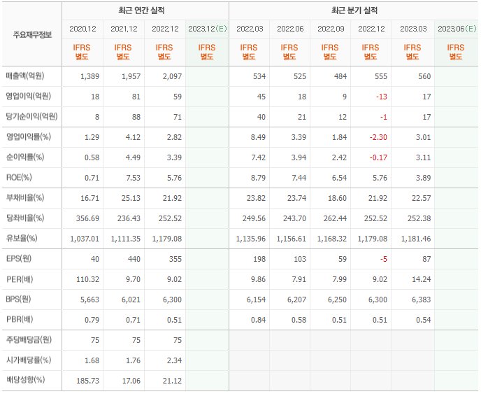 2022년 매출은 2097억, 영업이익은 59억, 당기순이익은 71억입니다. 그리고 영업이익률은 2.82%입니다.