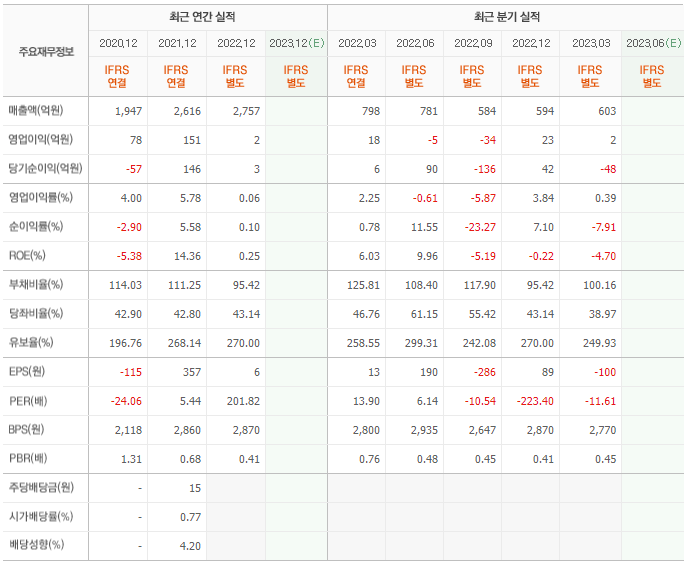 2022년 매출은 2757억, 영업이익은 2억, 당기순이익은 3억입니다. 그리고 영업이익률은 0.06%입니다.