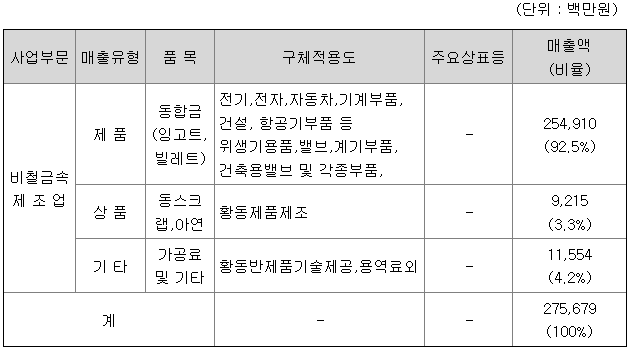 당사는 1988년 설립이래, 비철금속 부문에서 소재 산업을 선도하고 있는 신동업계 정상의 기업으로 주요제품은 황동빌레트, 인고트 및 동합금 제품 입니다. 최근 당사의 주요제품의 수요가 소비심리위축과 치열한 가격경쟁 및 내수시장의 해외이전 등으로 다소 불투명하나 그 사용범위가 자동차부품소재 및 전기, 반도체, 건설 및 가전 등 다양하기 때문에 그 수요는 꾸준히 늘어날 것으로 전망됩니다.