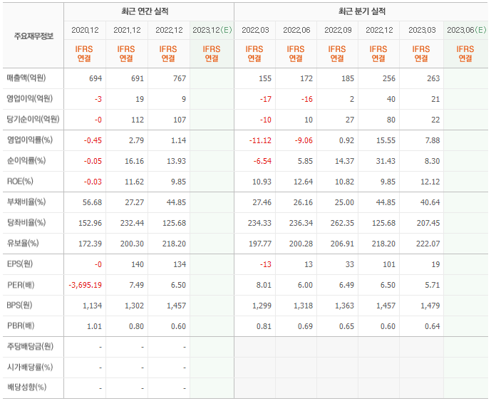 2022년 매출은 767억, 영업이익은 9억, 당기순이익은 107억입니다. 그리고 영업이익률은 1.14%입니다.