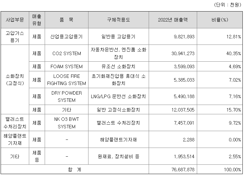 고압가스용기부문은 천연가스차량용 연료(천연가스)를 저장 및 수송 공급 목적의 천연가스 운송차량(CNG T/T)용기, 공기압력 용기(APV), 반도체세정용가스인 고순도가스저장용기(Y-TON 용기), 수소, 산소, 질소, CO2 등 특수산업용 고압용기의 재검사사업을 영위하고 있습니다.