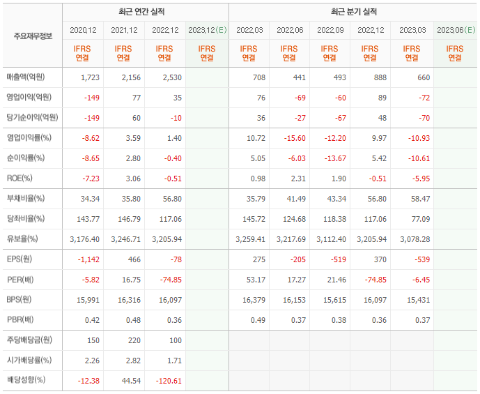 2022년 매출은 2530억, 영업이익은 35억, 당기순이익은 -10억입니다. 그리고 영업이익률은 1.40%입니다.