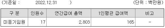 미등기임원의 평균연봉은 1억 6500만원이고 직원수는 17명입니다.