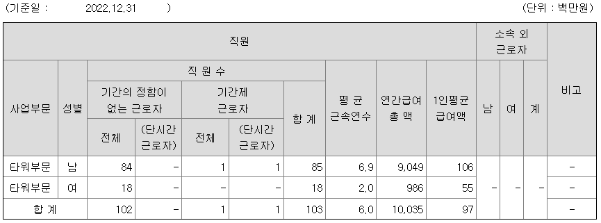 | 사업부문 | 성별 | 직원수 | 평균근속연수 | 평균연봉(백만) |