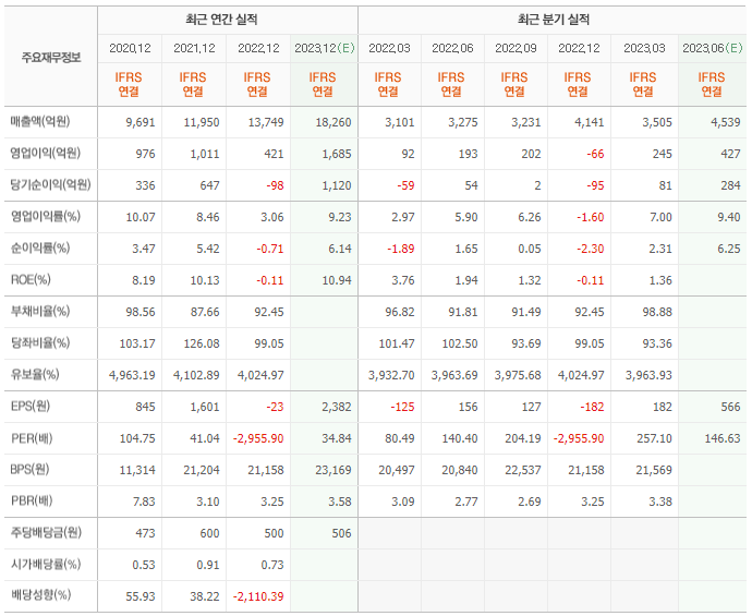 2022년 실적은 1조 3749억, 영업이익은 421억입니다. 그리고 영업이익률은 3.06%입니다.