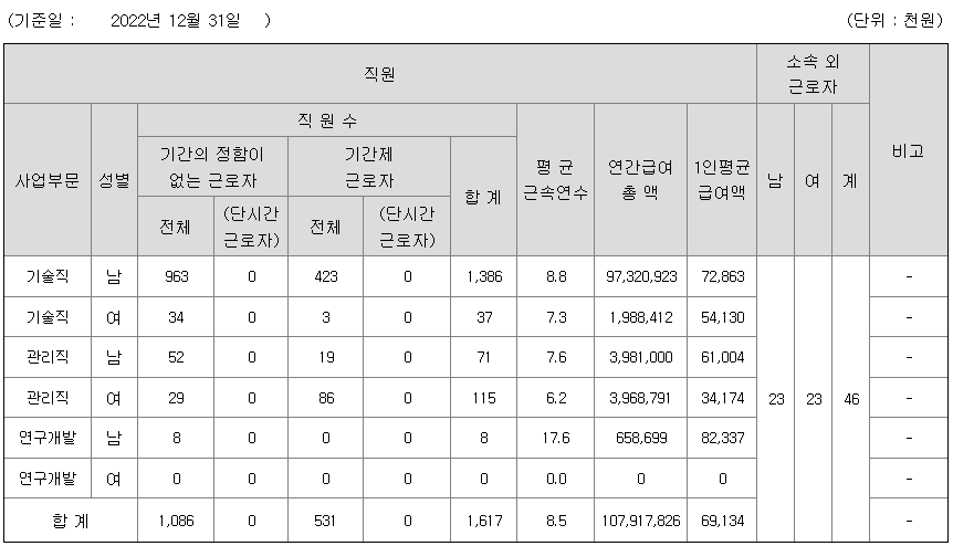 한국종합기술 연봉 2022년 기준 공시자료