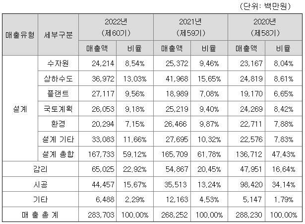 당사는 상하수도, 수자원개발, 도시계획, 환경, 도로, 교통, 교량, 터널, 항만, 철도 등 엔지니어링 전 분야에서 기획 ·타당성조사 ·설계 ·분석평가 ·감리 업무 등을 수행하는 종합건설엔지니어링 회사입니다. 당사는 주로 국가 및 지방자치단체 등에서 발주하는 다양한 공종의 엔지니어링 기술용역 업무를 주된 사업으로 영위하고 있으며, 설계 및 감리 업무 이외에도 시공 능력과 자재구매조달 능력 및 사업관리능력을 키우기 위하여 시공부분과 CM사업도 일부 수행하고 있습니다.