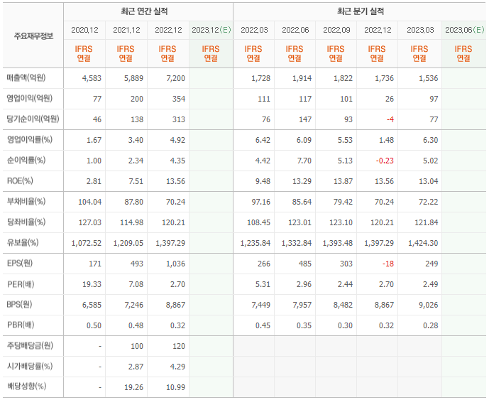 2022년 매출은 7200억, 영업이익은 354억, 당기순이익은 313억입니다. 그리고 영업이익률은 4.92%입니다.
