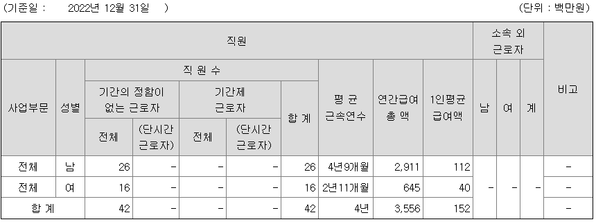 | 사업부문 | 성별 | 직원수 | 평균근속연수 | 평균연봉(백만) |