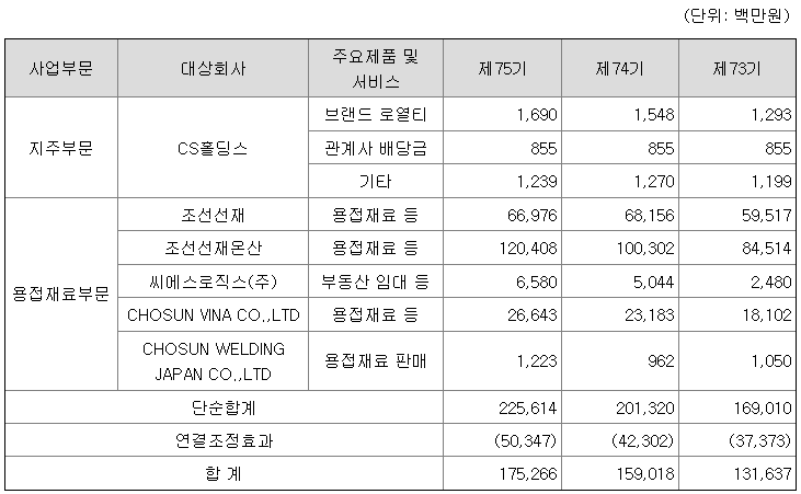 연결재무제표를 작성하는 CS홀딩스(주)는 지주회사로서 투자 부문을 담당하고 있으며 자회사로는 피복용접재료 사업 부문을 영위하는 조선선재(주)와 플럭스코어드와이어 용접재료 사업 부문을 영위하는 조선선재온산(주), 부동산임대 사업 부분을 영위하는 씨에스로직스(주), 용접재료 생산/판매를 영위하는 해외종속회사 CHOSUN VINA CO.,LTD와 CHOSUN WELDING JAPAN CO.,LTD가 있습니다.