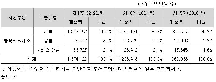 당사의 주요 제품인 타워를 기반으로 한 제품매출은 2022년말 연결매출의 95.1%인 13,074억원이며 기타 상품, 서비스 매출은 각각 연결매출액의 2.0%, 2.8% 입니다.