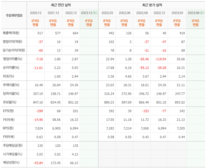 2022년 매출은 664억, 영업이익은 19억, 당기순이익은 39억입니다. 그리고 영업이익률은 2.87%입니다.
