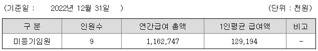 미등기임원의 평균연봉은 1억 2900만원이고 직원수는 9명입니다.
