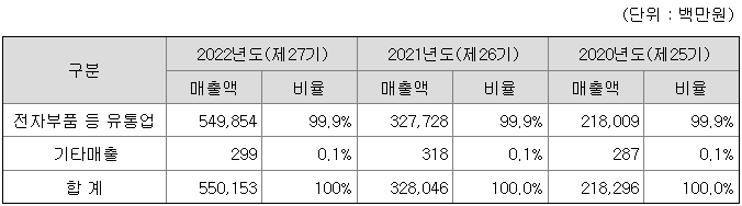 - 주요 제품은 메모리, 시스템반도체, 디스플레이 등 전자부품 유통업과 메모리 AS 서비스 기타매출 등으로 구성되며, 최근 3사업연도의 매출 현황은 아래와 같습니다.