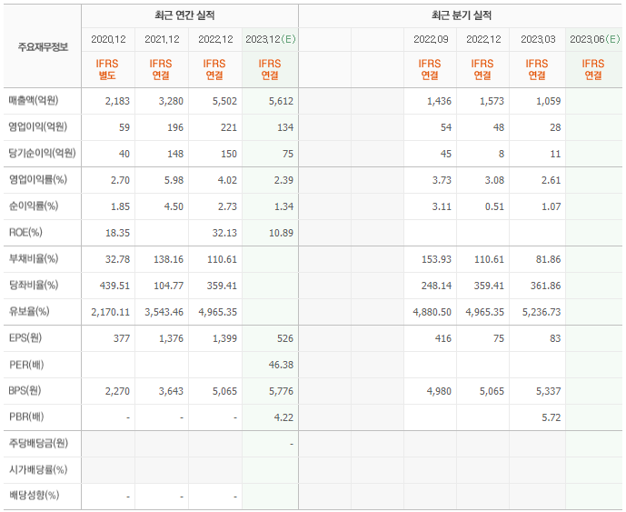 2022년 매출은 5502억, 영업이익은 221억, 당기순이익은 150억입니다. 그리고 영업이익률은 4.02%입니다.