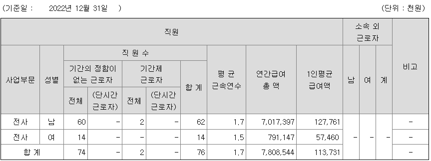 미등기임원의 평균연봉은 1억 4500만원이고 직원수는 2명입니다.