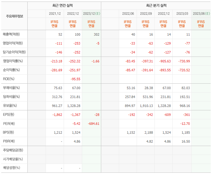2022년 매출은 100억, 영업이익은 -253억, 당기순이익은 -252억입니다. 그리고 영업이익률은 -252.32%입니다.