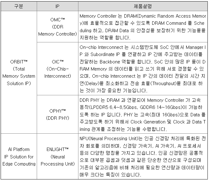 당사는 'AI for Everyone, Everywhere'라는 비전으로 인공지능 기술을 자율주행자동차, 보안카메라 등과 같은 엣지 환경에서 구현하기 위해 반드시 필요한 시스템반도체 설계 IP(Intellectual Property, 지적재산) 기술을 개발하는 기업입니다.