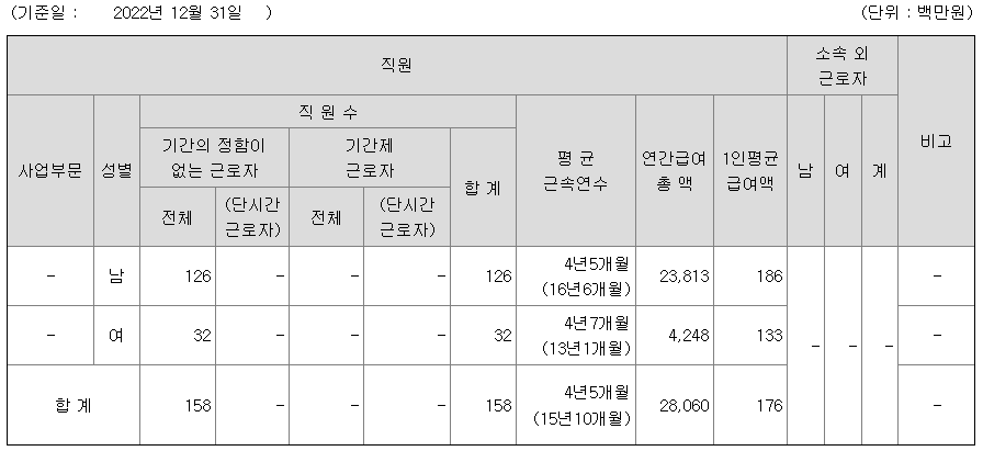 사업부문 | 성별 | 직원수 | 평균근속연수 | 평균연봉(백만) |