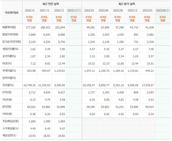 2022년 실적은 20조 3844억, 영업이익은 8080억입니다. 그리고 영업이익률은 3.96%입니다.