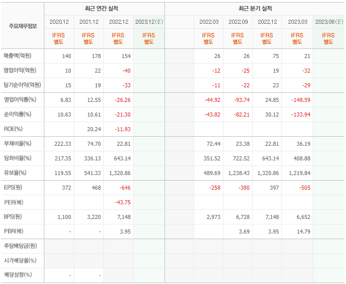 2022년 매출은 154억, 영업이익은 -40억, 당기순이익은 -33억입니다. 그리고 영업이익률은 -26.26%입니다.