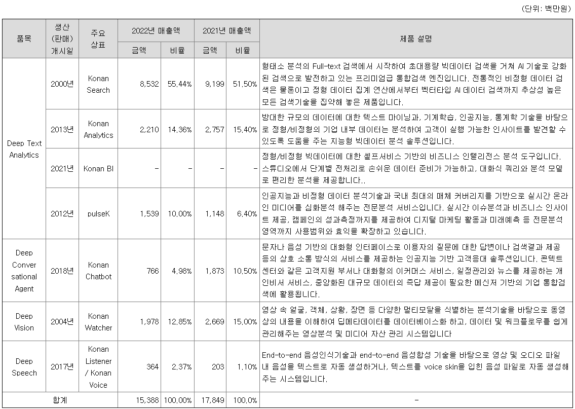 주요 기반기술을 기준으로 4제품군, 8제품으로 라인업됩니다. 4제품군은 딥컨버세이셔널에이전트(Deep Conversational Agent)[코난챗봇], 딥비전(Deep Vision)[코난와처], 딥스피치(Deep Speech)[코난보이스],[코난리스너] 그리고 딥텍스트애널리틱스(Deep Text Analytics)로 구성되어 있습니다. 딥텍스트애널리틱스 제품군 하위에 4개의 상용제품 [코난서치], [코난애널리틱스], [코난BI], [펄스케이]이 포함되어 있습니다.