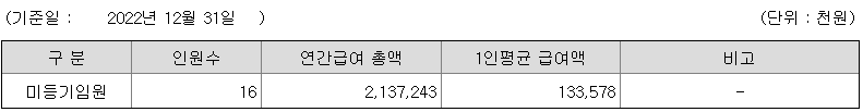 미등기임원의 평균연봉은 1억 3300만원이고 직원수는 16명입니다.