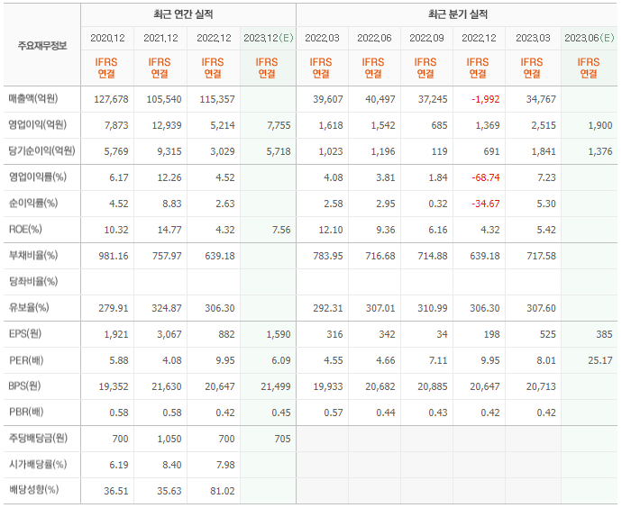 2022년 실적은 11조 5357억, 영업이익은 5214억입니다. 그리고 영업이익률은 4.52%입니다.