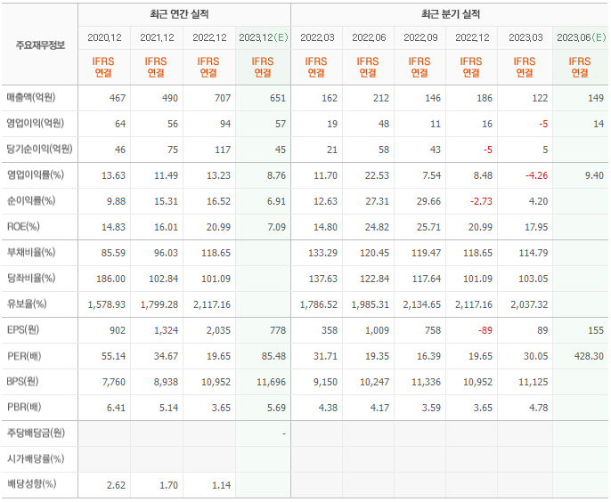2022년 매출은 707억, 영업이익은 94억, 당기순이익은 117억입니다. 그리고 영업이익률은 13.23%입니다.