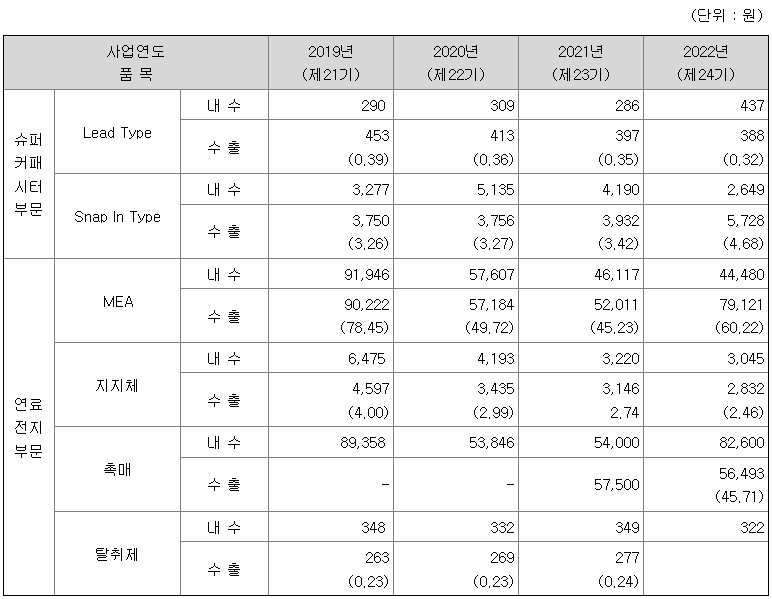 2022년 슈퍼커패시터의 신규시장 진입과 건물용 연료전지의 납품수량 증대로 당해연도 매출과 영업이익은 각각 44.2%, 66.2% 증가한 217억원, 37억원을 시현하였습니다.