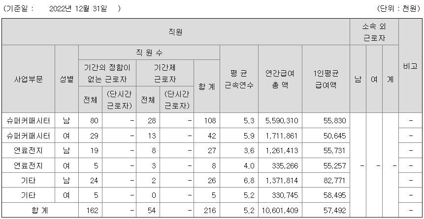| 사업부문 | 성별 | 직원수 | 평균근속연수 | 평균연봉(백만) |