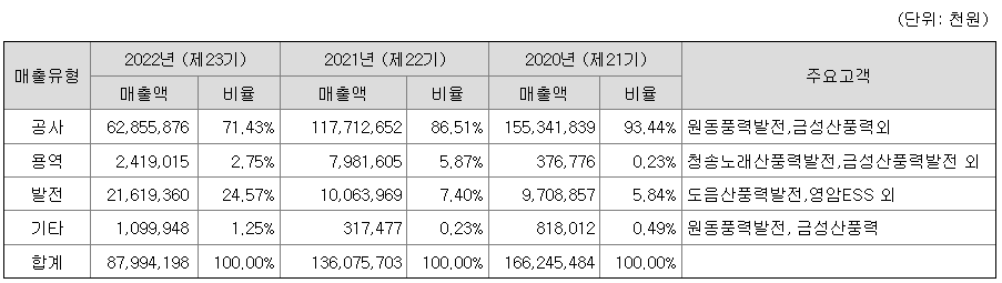 주요 사업은 부문은 ① 풍력, 태양광, ESS 등을 비롯한 신ㆍ재생에너지 발전소 건설을 제공하는 공사부문 ② 발전소 O&M, 업무위탁, 사전개발 용역 등을 제공하는 용역 부문, ③ 직접 개발하거나 투자하여 운영중인 신ㆍ재생에너지 발전소를 통해 전력 판매 수익을 창출하는 발전부문이 있습니다.
