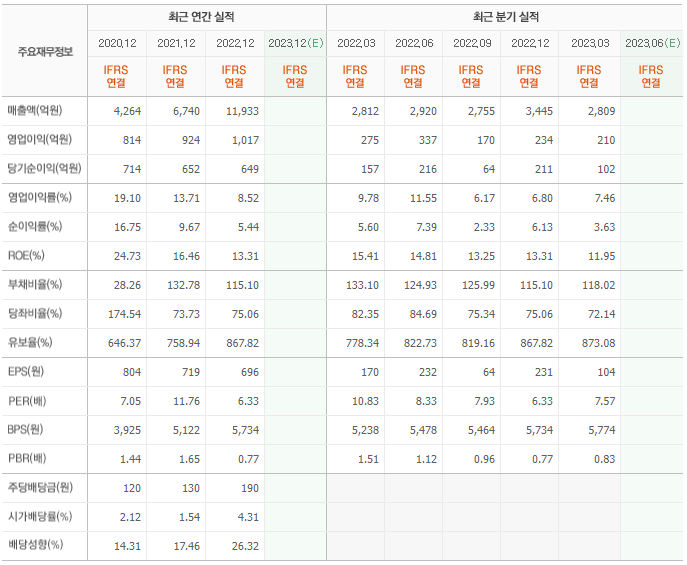 2022년 매출은 1조 1933억, 영업이익은 1017억, 당기순이익은 649억입니다. 그리고 영업이익률은 8.52%입니다.