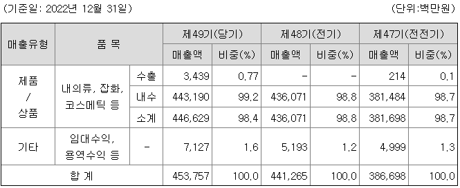 패션사업부는 주요 제품인 내의, 의류와 더불어 잡화, 화장품 상품을 유통하고 있으며, 제품/상품 매출액이 패션사업부 매출비중 대부분을 차지합니다.