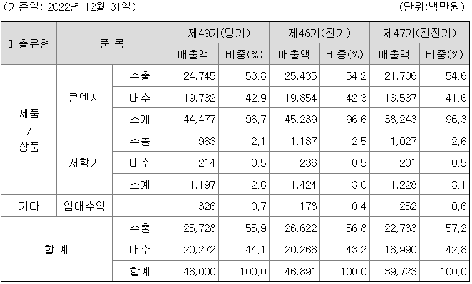 전자사업부의 주요 제품은 콘덴서이며, 해당 제품의 전방산업은 크게 가전제품 시장과 자동차 시장으로 볼 수 있습니다. 제49기 기준 전자사업부의 콘덴서 매출액은 약 445억 원으로 전자사업부 전체 매출액 대비 96.7%의 매출 비중을 차지하고 있습니다.